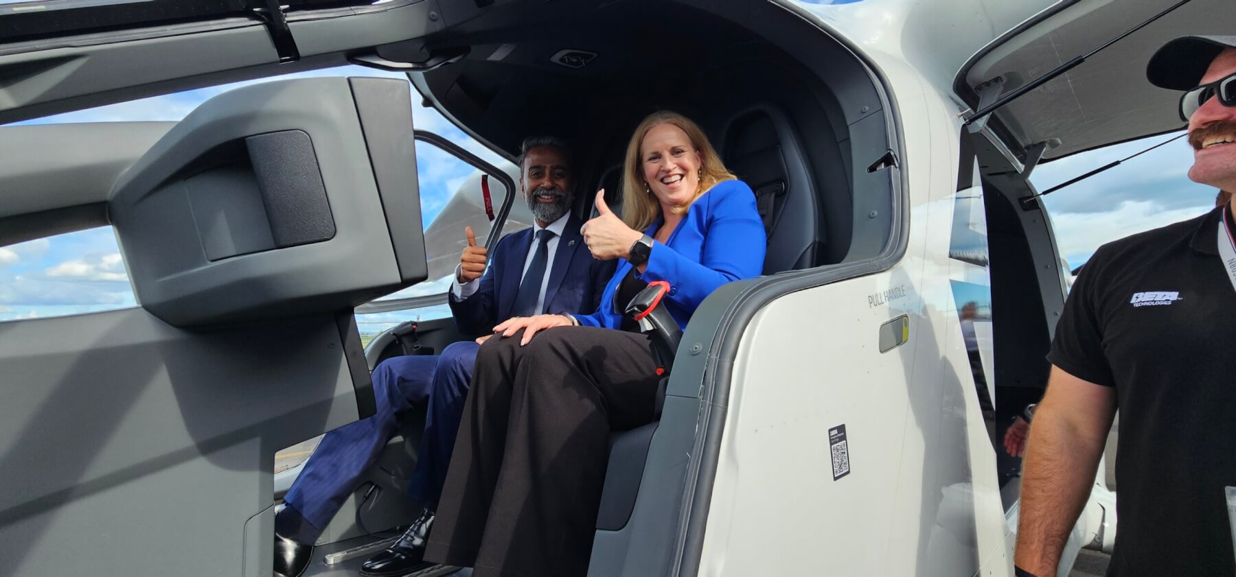 Taupo MP and Tourism Minister Louise Upston seated in Air New Zealand’s Beta Alia CX300 with Air New Zealand chief executive Nikhil Ravishankar. Photo: Mary Anne Gill