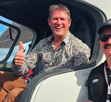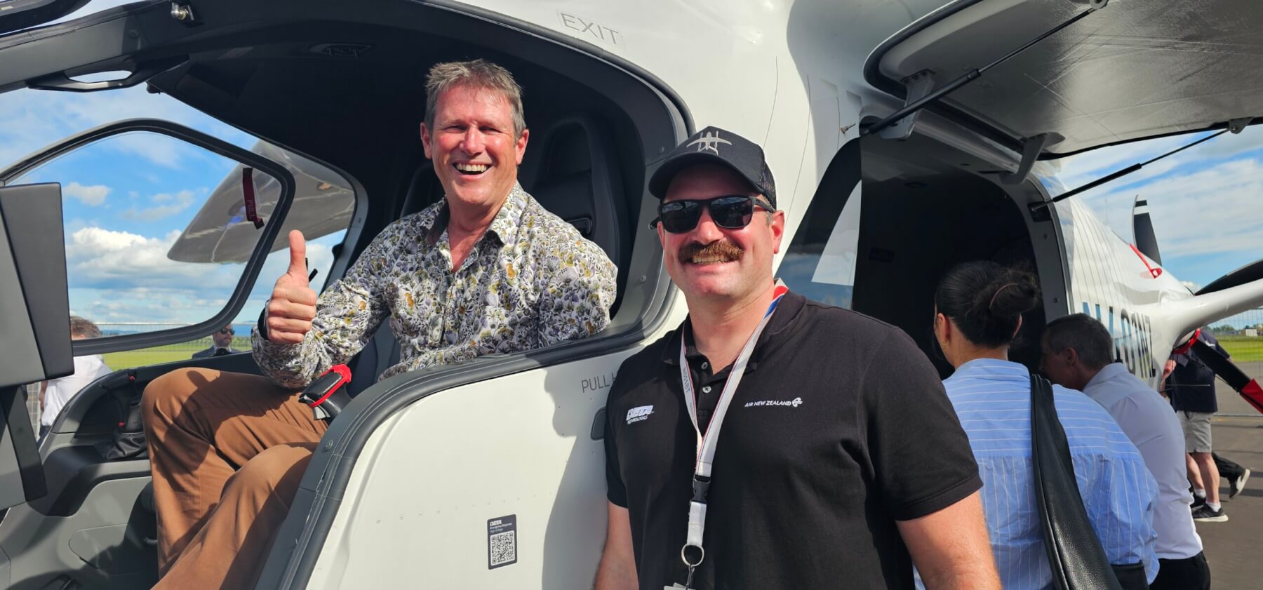 Waipa mayor Mike Pettit inside the electric plane with Air NZ pilot Nathan Dubie.