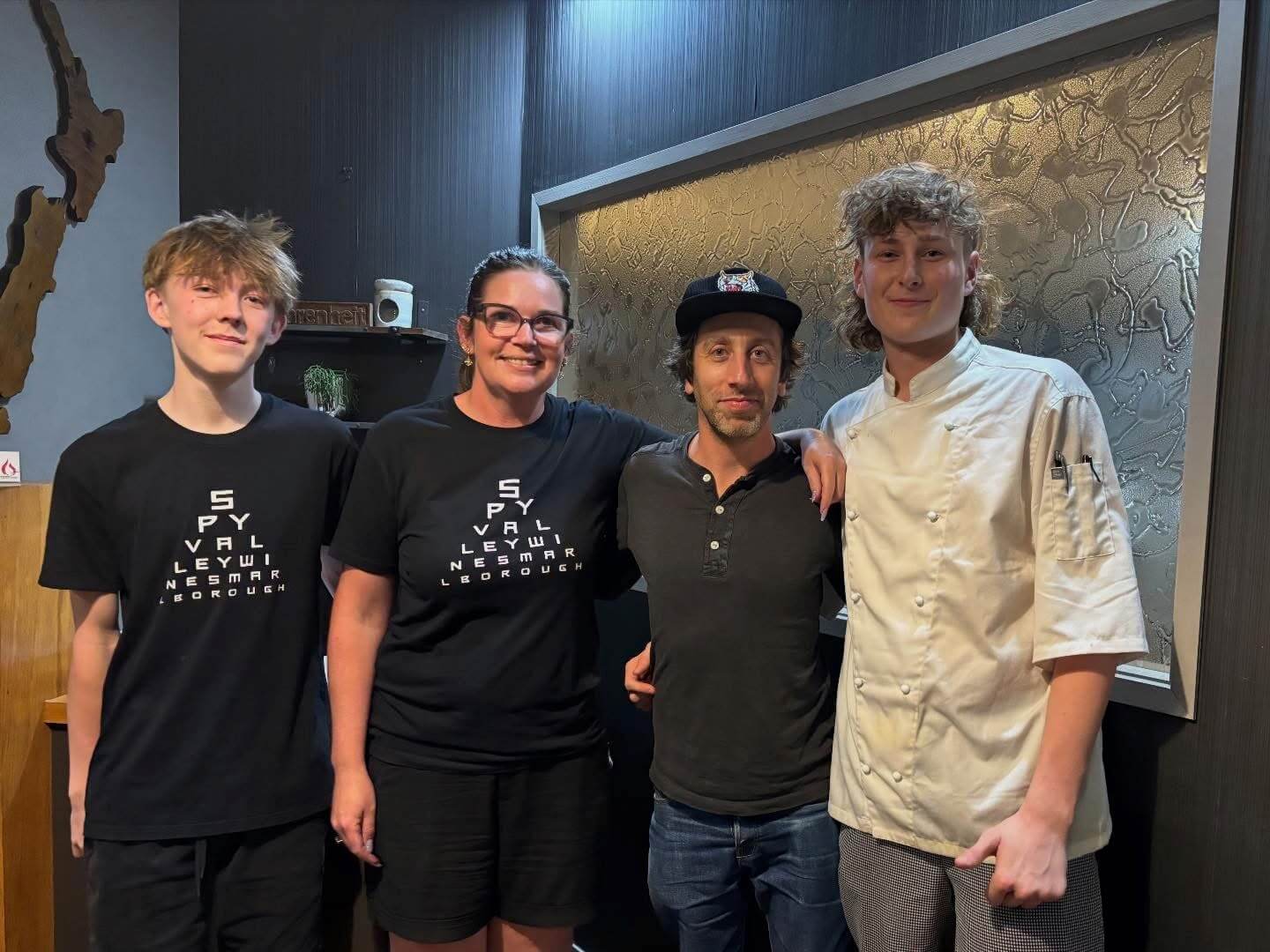 Simon Helberg pictured with Fahrenheit staff Thomas Wright, Khrystal Parkes and Hunter Brown. Photo: Fahrenheit Restaurant & bar.