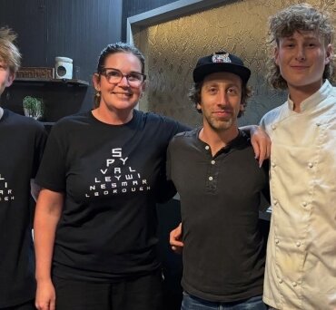 Simon Helberg pictured with Fahrenheit staff Thomas Wright, Khrystal Parkes and Hunter Brown. Photo: Fahrenheit Restaurant & bar.