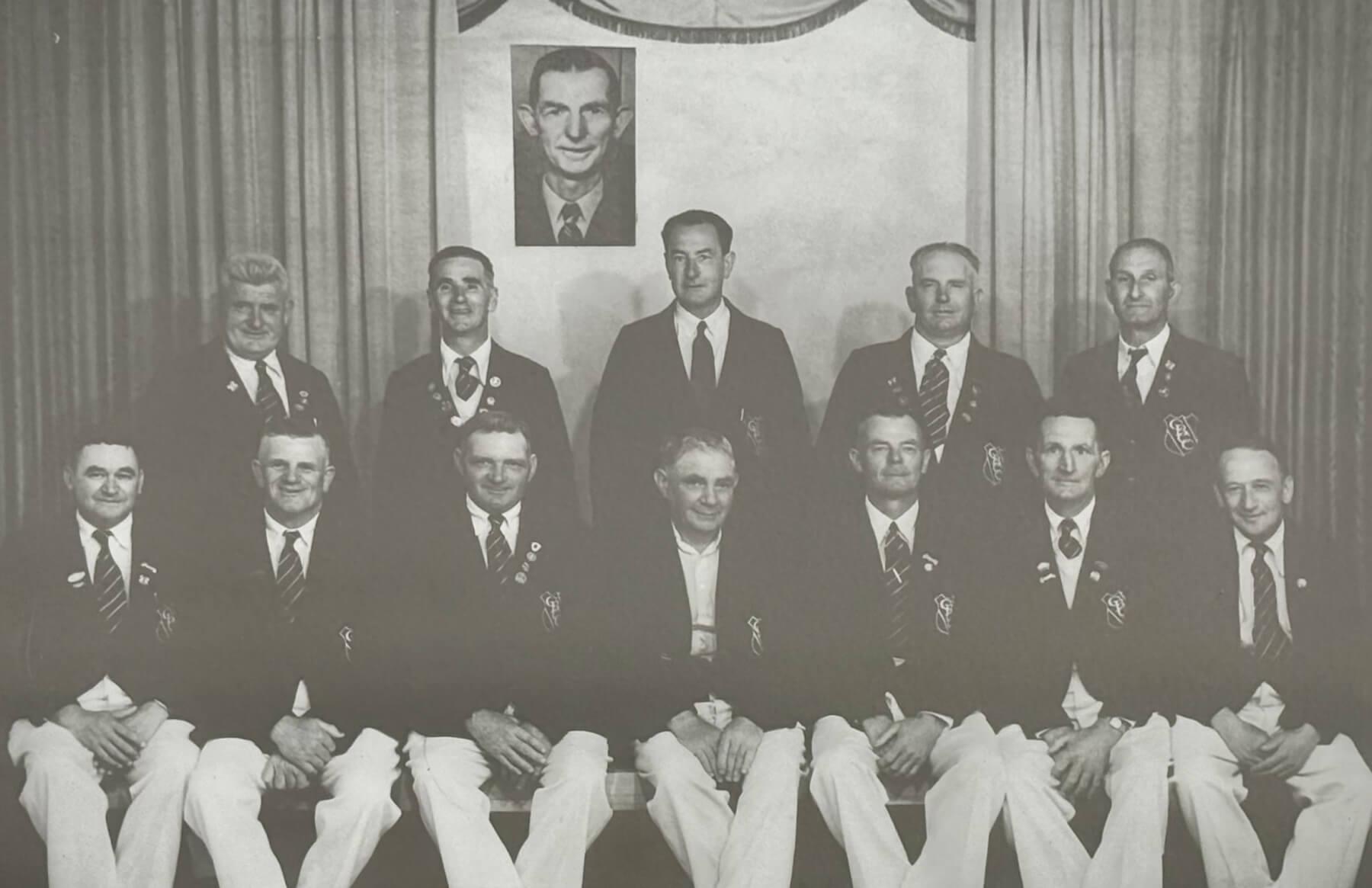 Foundation members in 1945 – Back row, from left: W. Milicich, L. Kerry, L. Webber, H.W. Campin, K.N. Glenie. Front row: E.A. Morrice, M.K. Trott, A. Paton, F.A. Grives, T. Appleby, W.C. Arnold, E.T. Stacey. Inset: D.C.S. Walker. The other foundation members were W. Bobbett, L.C. Hooker, D. McCathie, A. Sturgeon, R. Frost, R. Kerry, W. Meanie and W.P. Cummings.