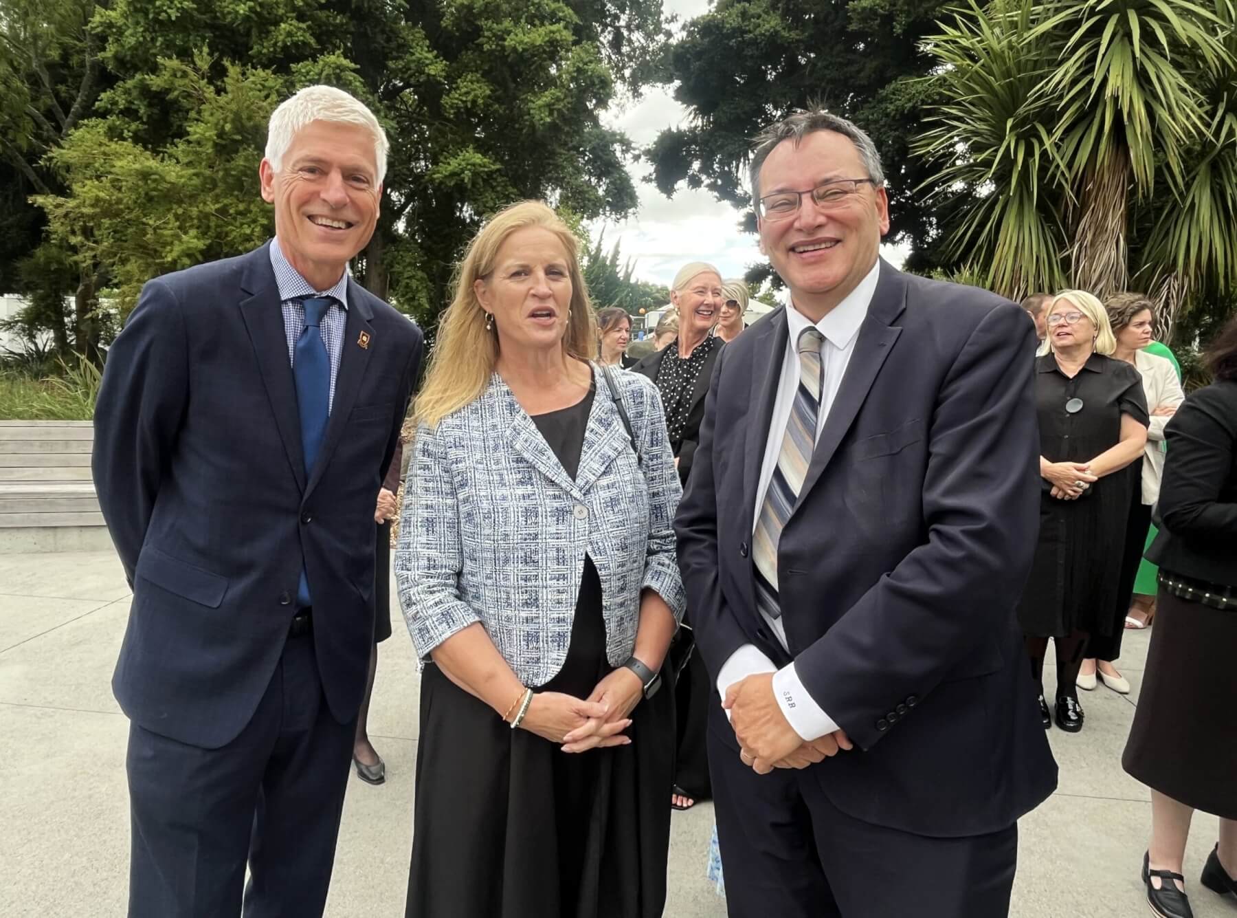 Taupo MP Louise Upston, flanked by Hamilton Mayor Tim Macindoe, left, and Universities Minister Dr Shane Reti.