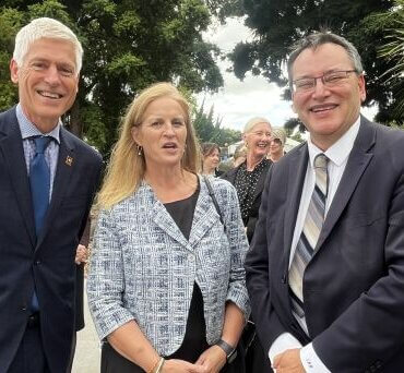 Taupo MP Louise Upston, flanked by Hamilton Mayor Tim Macindoe, left, and Universities Minister Dr Shane Reti.
