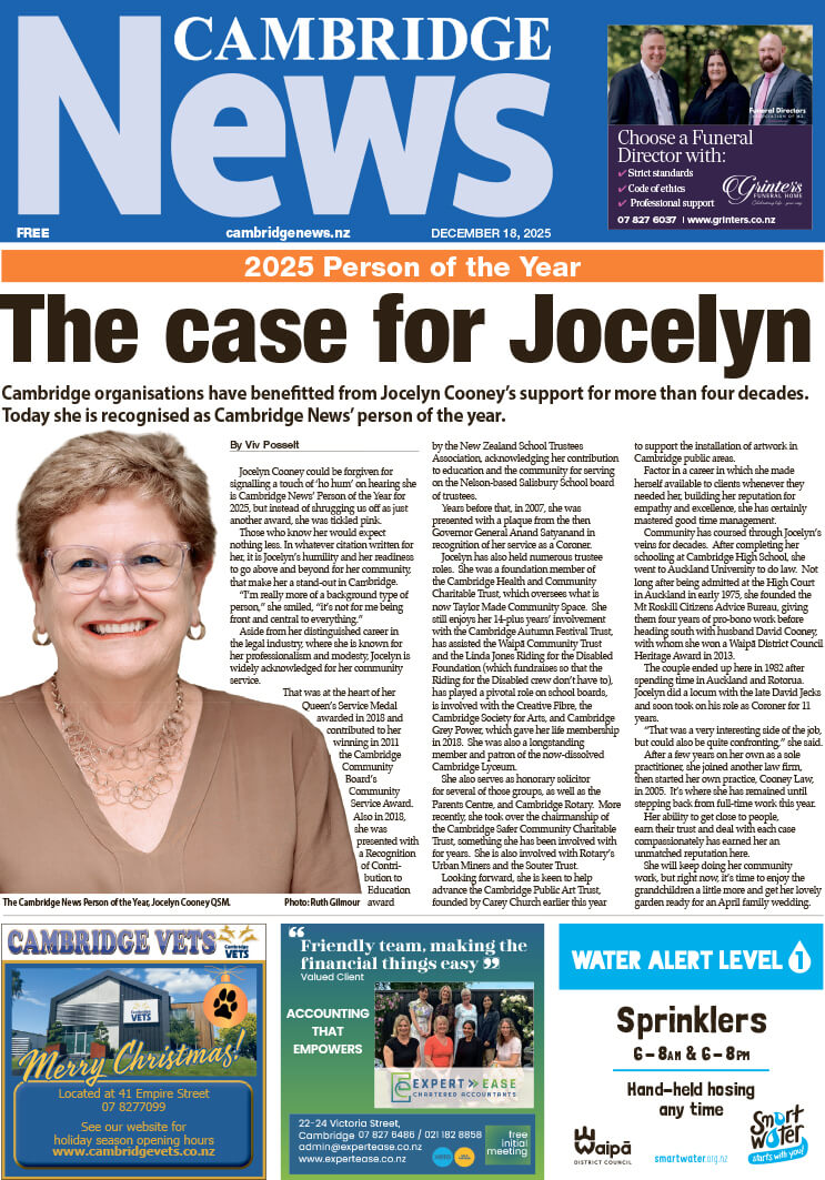Community has coursed through Jocelyn’s veins for decades. After completing her schooling at Cambridge High School, she went to Auckland University to do law. Not long after being admitted at the High Court in Auckland in early 1975, she founded the Mt Roskill Citizens Advice Bureau, giving them four years of pro-bono work before heading south with husband David Cooney, with whom she won a Waipā District Council Heritage Award in 2013.