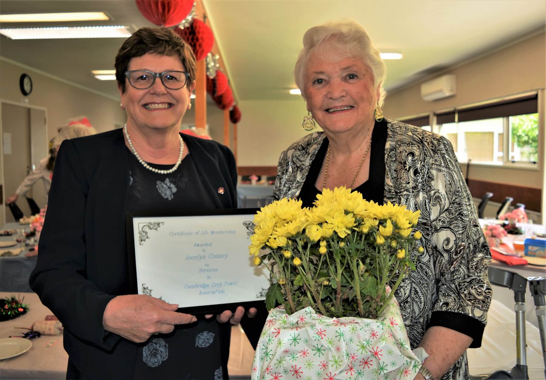 The 2018 picture of Jocelyn Cooney receiving her life membership award from Cambridge Grey Power, presented by then president, Val Massey. Photo: Viv Posselt