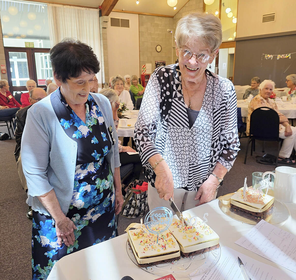60s Up national president Helen Michael, left, and Cambridge 60s Up founder Faye Gohns cutting the anniversary cake.